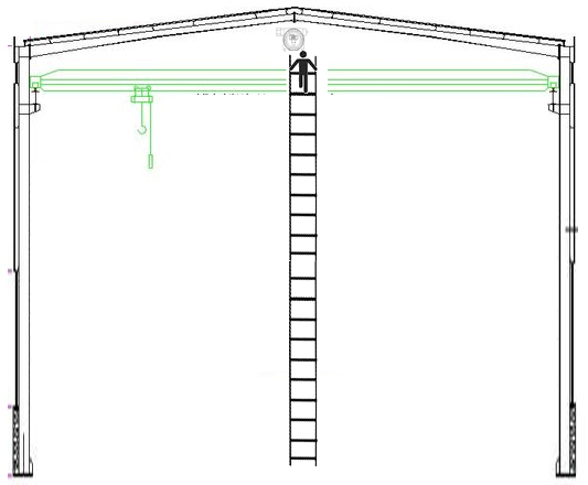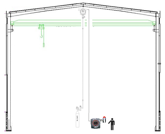 針對輕于空氣的可燃有毒氣體的檢測,一般會在廠房最高處易于聚集氣體的位置安裝氣體檢測器。氣體檢測器需要定期做校準和維護,此時就涉及到如何維護的問題,傳統(tǒng)的做法是維護人員攜帶工具及標準氣瓶爬梯子上到高處予以維護,危險性大,可操作性差。具體做法如下圖所示。