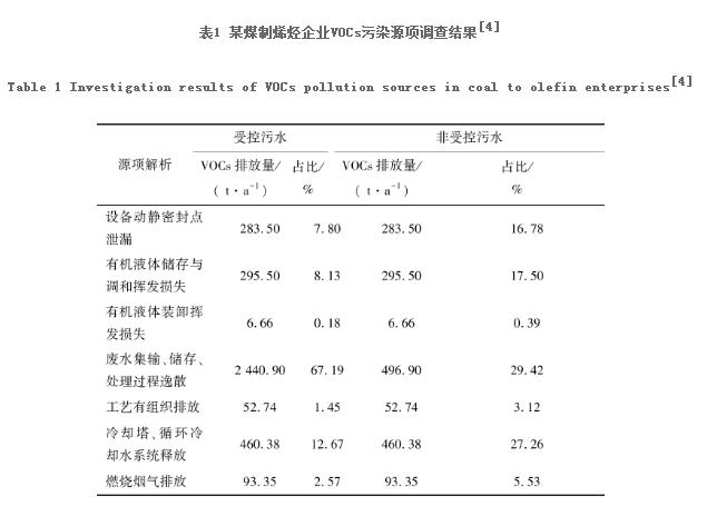 目前,我國只有少數(shù)現(xiàn)代煤化工企業(yè)開展了VOCs核查。表1為某煤制烯烴企業(yè)VOCs的源項(xiàng)核查結(jié)果(將氣化灰水及污水汽提塔底凈化水分為受控污水和非受控污水2種情況)[4]。