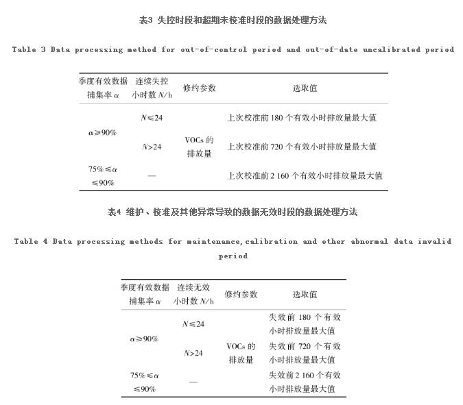 數(shù)據(jù)審核方面,可參照HJ 75提出有效數(shù)據(jù)捕集率全年必須達(dá)75%。失控時(shí)段的數(shù)據(jù)可按照表3中的方法對(duì)VOCs排放量進(jìn)行修約,非甲烷總烴濃度和廢氣參數(shù)不修約。故障期間、維修期間的數(shù)據(jù),可使用參比方法監(jiān)測的數(shù)據(jù)替代,也可按照表4中的方法對(duì)VOCs排放量進(jìn)行修約,非甲烷總烴濃度和廢氣參數(shù)不修約。當(dāng)采用參比方法監(jiān)測的數(shù)據(jù)替代時(shí),頻次不低于每天1次,參比方法的監(jiān)測過程按照GB/T 16157、HJ/T 397、HJ 732、HJ 38要求進(jìn)行,替代數(shù)據(jù)包括非甲烷總烴濃度、廢氣參數(shù)和VOCs排放量。維護(hù)保養(yǎng)和校準(zhǔn)及其他異常導(dǎo)致的數(shù)據(jù)無效時(shí)段,VOCs排放量按照表4處理,非甲烷總烴濃度和廢氣參數(shù)不修約。