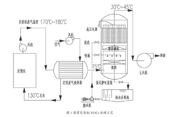 系統(tǒng)包括:定型廢氣換熱系統(tǒng)、濕式靜電裝置系統(tǒng)、主風(fēng)機(jī)等,主要設(shè)備參數(shù)見表1。