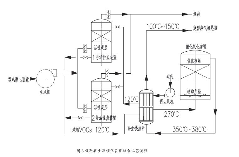 在主風(fēng)機(jī)出口引入活性炭裝置和催化氧化裝置(圖3)。活性炭裝置設(shè)置2套,互為備用,當(dāng)一套活性炭裝置吸附飽和后,將廢氣切換到另一套活性炭裝置。飽和的活性炭裝置進(jìn)入活性炭再生,脫附的有機(jī)物引入催化氧化裝置分解成水和二氧化碳。經(jīng)催化氧化裝置處理后的廢氣再回至定型廢氣換熱器回收余熱。