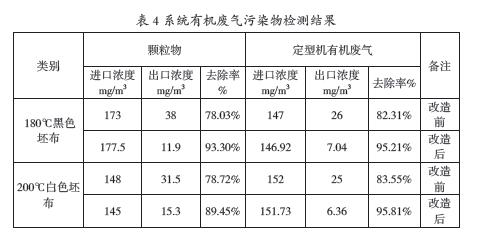 該文所提出的紡織印染定型機(jī)有機(jī)廢氣凈化處理技術(shù)工藝,即在原定型有機(jī)廢氣濕式靜電處理系統(tǒng)的基礎(chǔ)上進(jìn)行技術(shù)改造,新增加了活性炭吸附、再生處理和催化氧化裝置系統(tǒng),VOCs總的脫除效率達(dá)到95%以上。通過現(xiàn)場實(shí)際檢測顆粒物除效率為93.3%和89.45%,VOCs總的脫除效率為95.21%和95.81%。