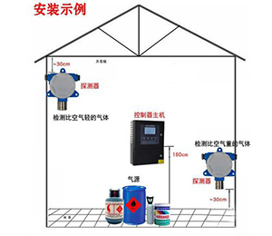 10、對于檢測可燃氣體比重大于空氣的諸如烷烴類(甲烷沼氣、民用煤氣除外)、烯烴類(乙烯除外),液化石油氣、汽油、煤油時,請將探測器安裝在低于泄漏點的下方平面上,距地面不得高于30cm。并請注意周圍的環(huán)境特點,例如室內(nèi)通風(fēng)不流暢部位,地槽地溝容易積聚可燃氣體的地方,現(xiàn)場通往控制室的地下電纜溝,有密封蓋板的污水溝槽等,都是經(jīng)常性的或在生產(chǎn)不正常情況下容易積聚可燃氣的場所,對于這些環(huán)境都是不可忽視的安全監(jiān)測點。