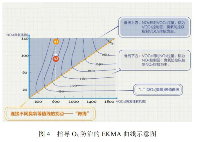 O3生成不僅與前體物VOCs、NOx排放量有關(guān),同時與兩者的比例密切相關(guān),呈現(xiàn)復(fù)雜的非線性響應(yīng)關(guān)系。經(jīng)典的EKMA曲線可用于揭示VOCs和NOx生成O3的復(fù)雜關(guān)系[3](見圖4),在VOCs和NOx為坐標(biāo)軸的圖上,O3等值曲線是一條條近似等高線的“L”型曲線,連接不同O3等值線的拐點(diǎn)可以形成一條“脊線”,在脊線上方,NOx相對VOCs過量,稱為VOCs控制區(qū)—O3防控以控制VOCs排放為主;在脊線下方,VOCs相對NOx過量,稱為NOx控制區(qū)—O3防控以控制NOx為主。在VOCs控制區(qū),VOCs排放保持不變,減排NOx,O3濃度有可能上升。相關(guān)研究表明,我國O3污染重點(diǎn)區(qū)域總體上為VOCs與NOx協(xié)同控制區(qū),但多數(shù)市區(qū)為VOCs控制區(qū),主要受烯烴、芳香烴和醛類的控制。因此,“十四五”期間O3控制應(yīng)強(qiáng)調(diào)VOCs和NOx協(xié)同減排,特別是應(yīng)加大VOCs的減排力度。