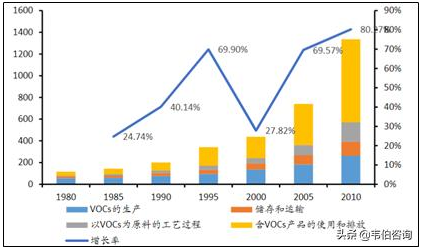 圖表 1:1980年以來中國工業(yè)源VOCs排放總量變化趨勢(萬噸)