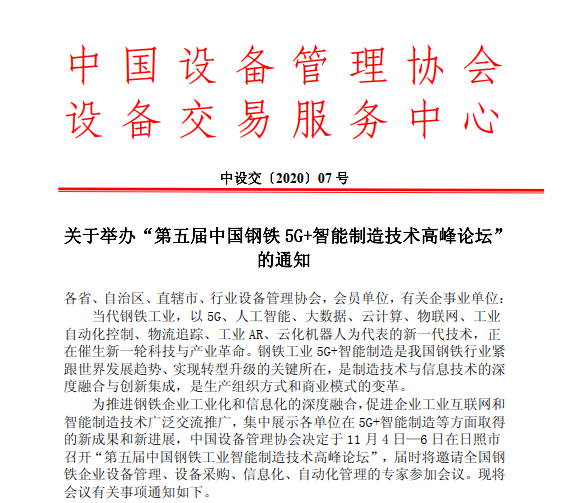 我司將于2020年11月4日-11月6日受邀參加在日照舉行的第五屆中國鋼鐵5G+智能制造技術高峰論壇。誠摯邀請您的到來。